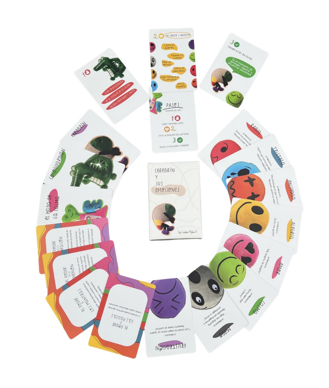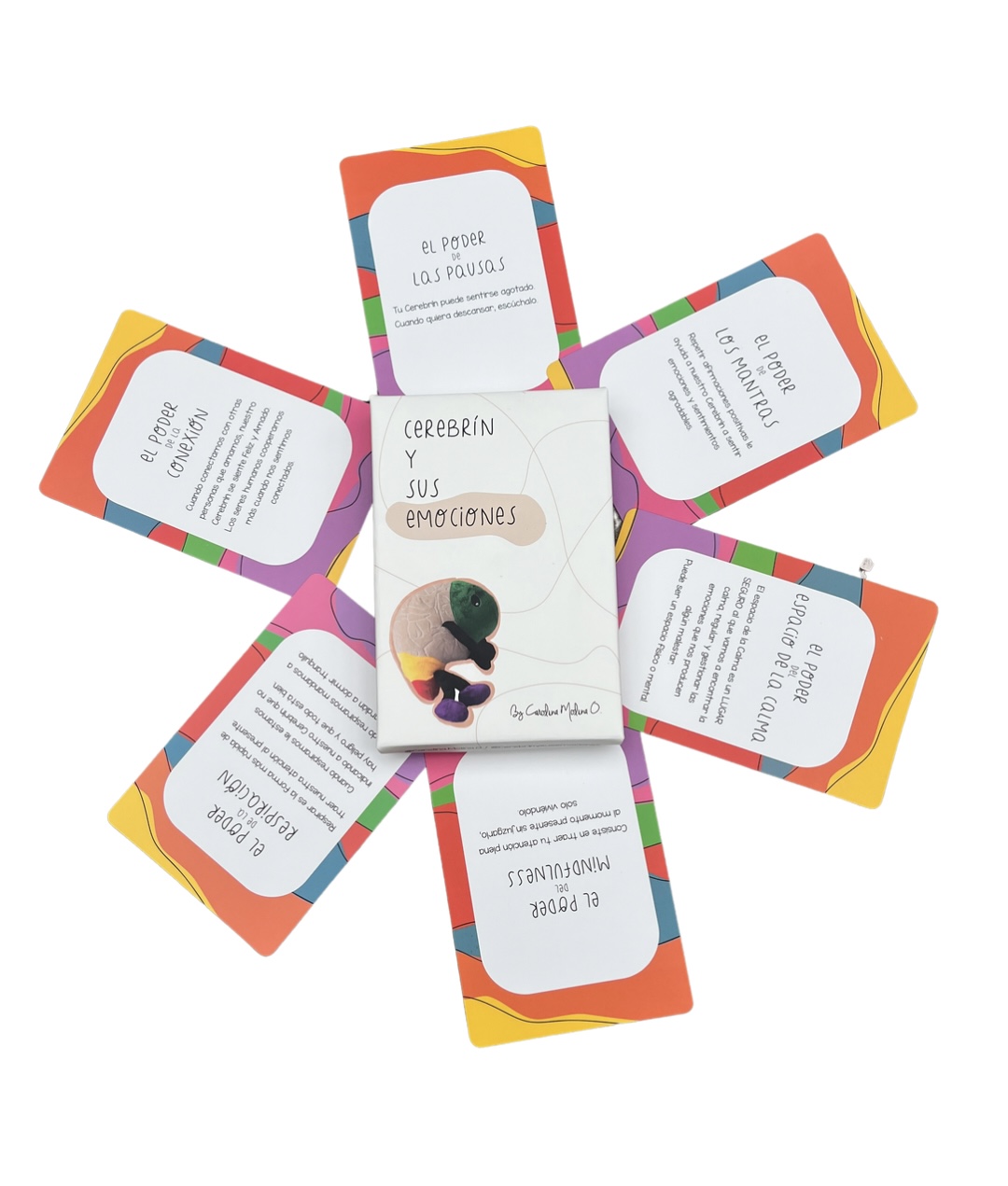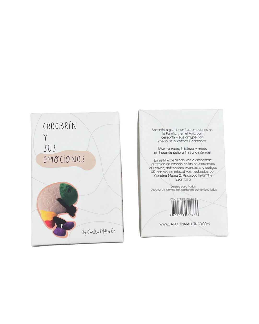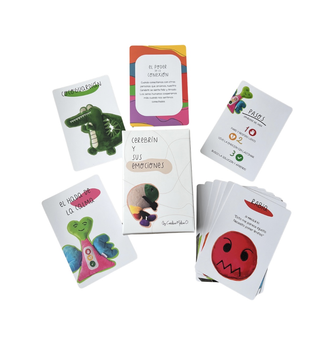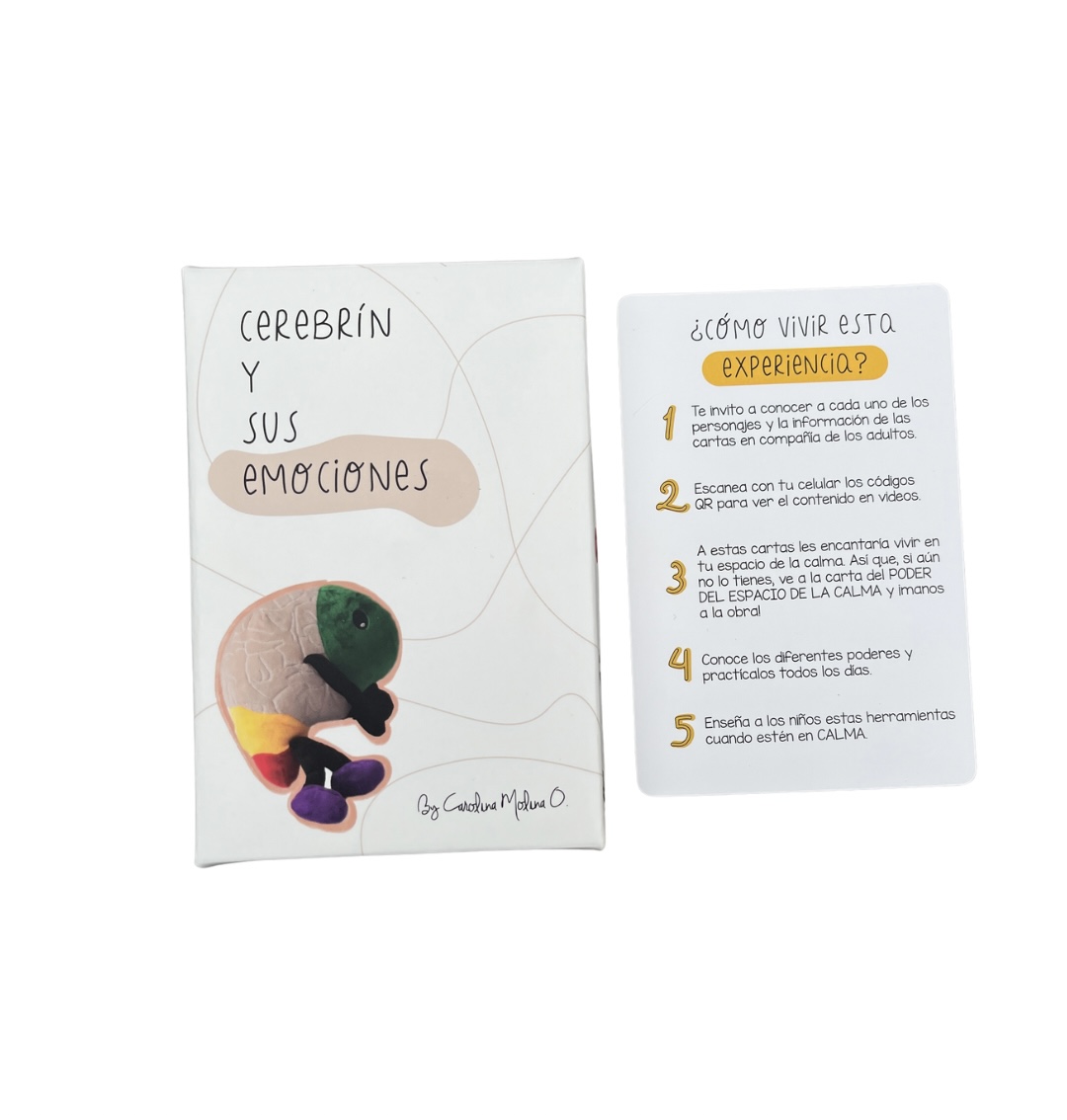Flashcards «Cerebrín y sus emociones» Flashcards «Cerebrín y sus emociones»$20 Quantity Añadir al carrito Comprar en Amazon Descripción Cerebrín y sus emociones es una experiencia educativa en forma de flashcards para niños, familias, educadores y terapeutas basada en las neurociencias afectivas y el mindfulness para aprender a gestionar emociones sanamente en familia y desarrollar la inteligencia emocional. Incluye 20 tarjetas con contenido por ambos lados y contienen información educativa, dibujos, actividades y códigos QR que conectan a las personas con videos educativos elaborados por Carolina Molina O. mamá, Psicóloga infantil, Coach y Autora Best Seller de dos libros publicados por Peguin Random House en el sector de la Crianza. Al interior vas a encontrarte con Cerebrín y Cocoguardián los personajes principales de esta experiencia, los cuales se convierten en un referente para que los niños puedan tener una mejor comprensión del funcionamiento del cerebro y de los comportamientos agresivos. Las 8 emociones que aparecen en cada una de las tarjetas vienen acompañados con la forma para gestionarlas sanamente y el mensaje que trae cada una de ellas. Al final también aparecen unos poderes mágicos que se recomiendan aplicar en el día a día para lograr una mayor regulación emocional y promover el bienestar en los niños y los adultos. APLICA PARA ENVÍOS EN COLOMBIA